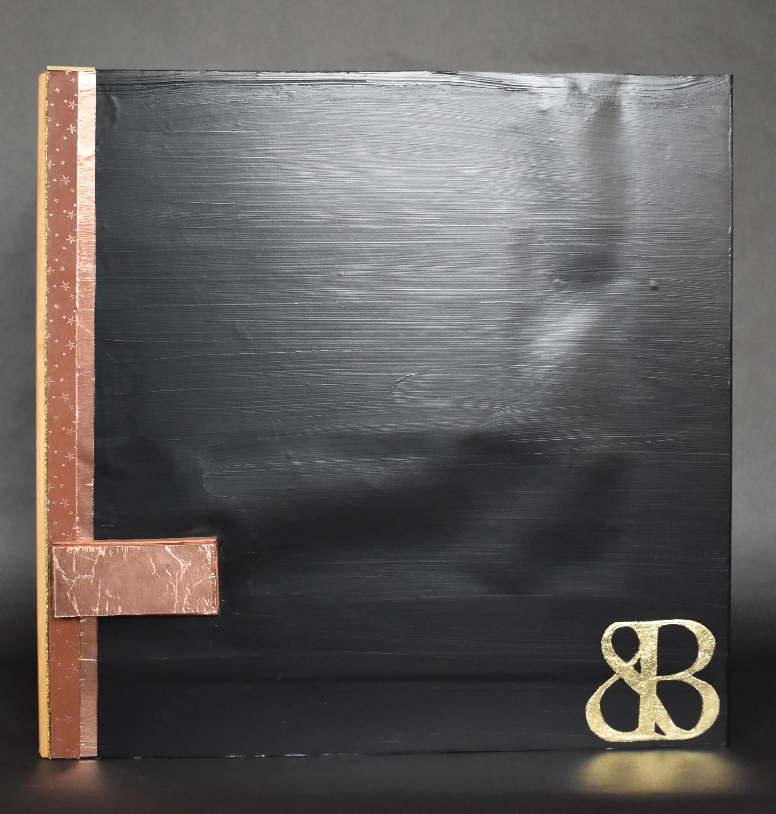 The book case is made out of cardboard, the details are copper acrylic paint and fine paper with wood details.