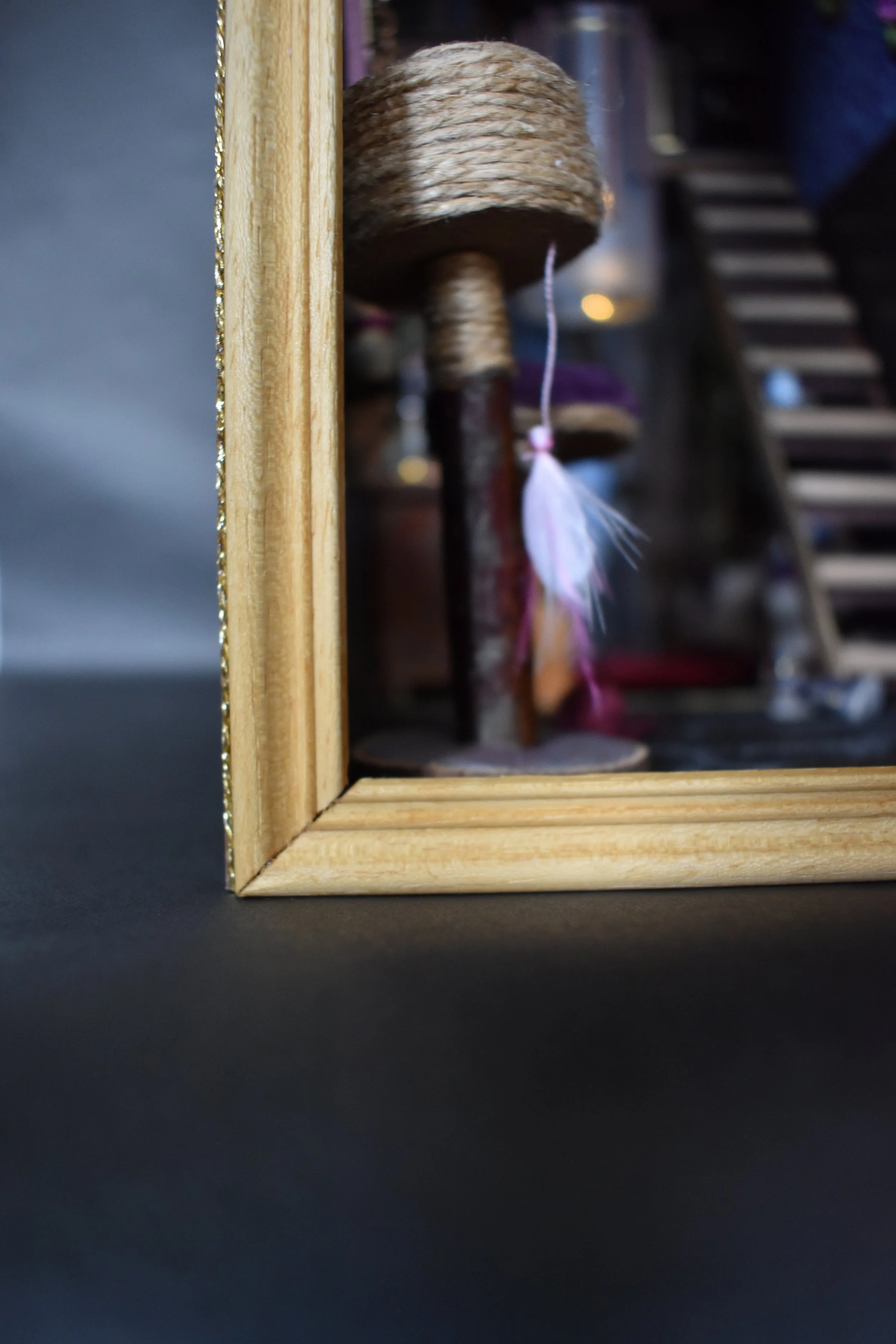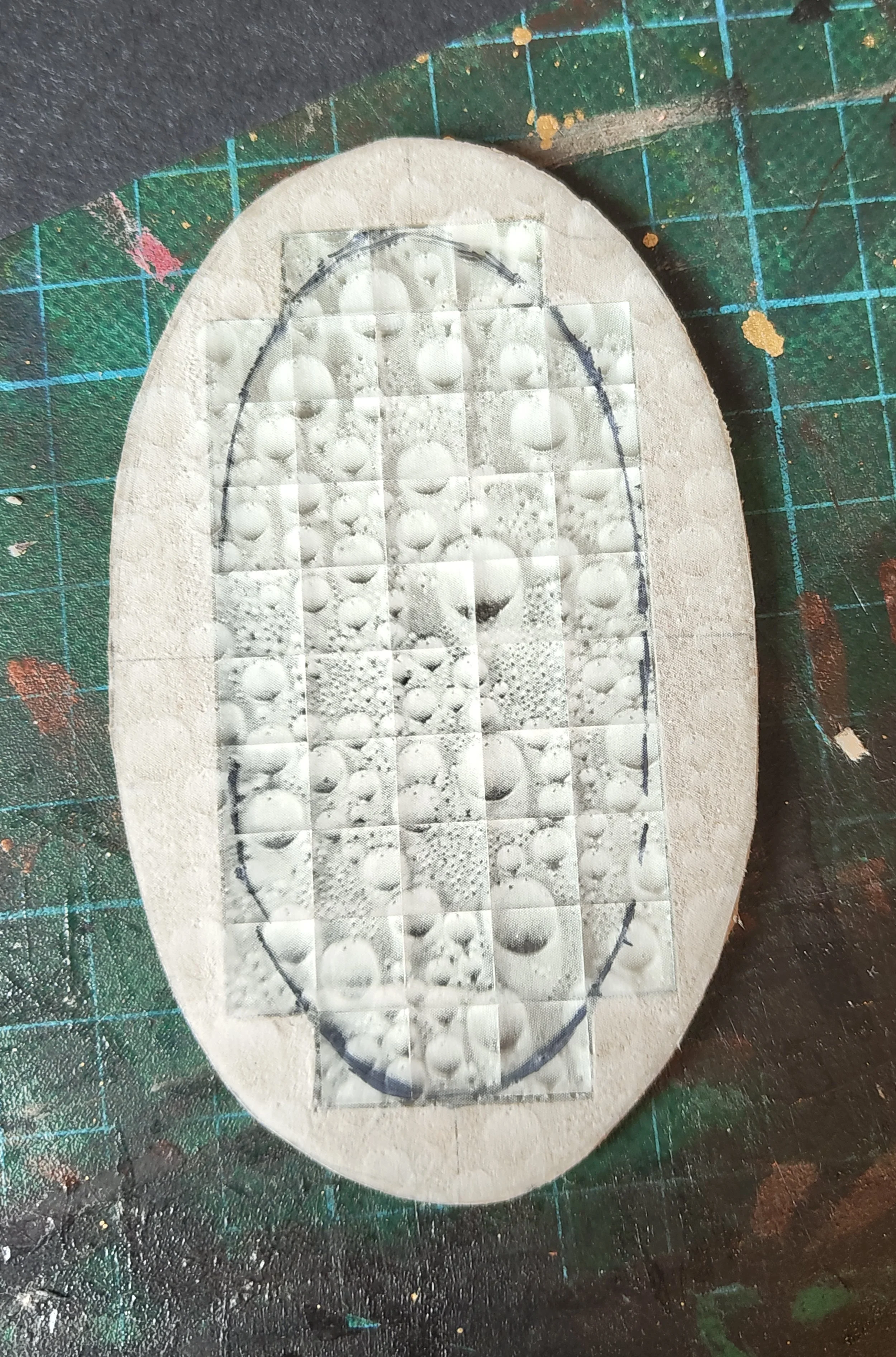 I wanted a mirror but the only thing I had were tiny square tiles of mirror. I glued them on a piece of paper, added a boarder around it so everything was flush. Added foil over the piece, drew an oval and cut the boarder off it. I wanted to protect the mirror part from glue and paint. After I added the new boarder and paint I removed the foil and added the last details.