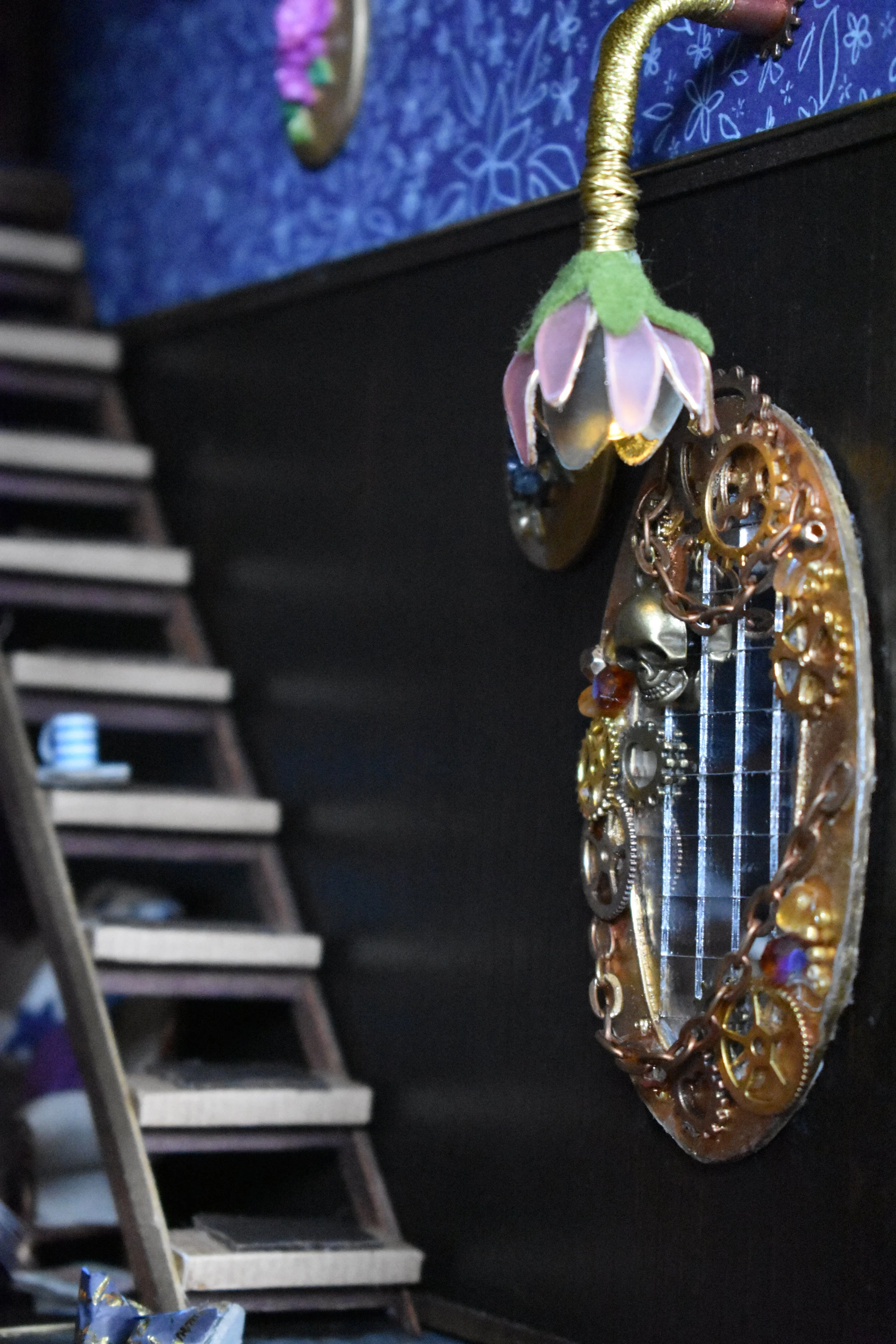 The big chandelier, this was a happy accident. I saw an empty packaging from washi tapes and sanded the outside and made the necessary adjustments. I added details in wood and made holes for the lights.