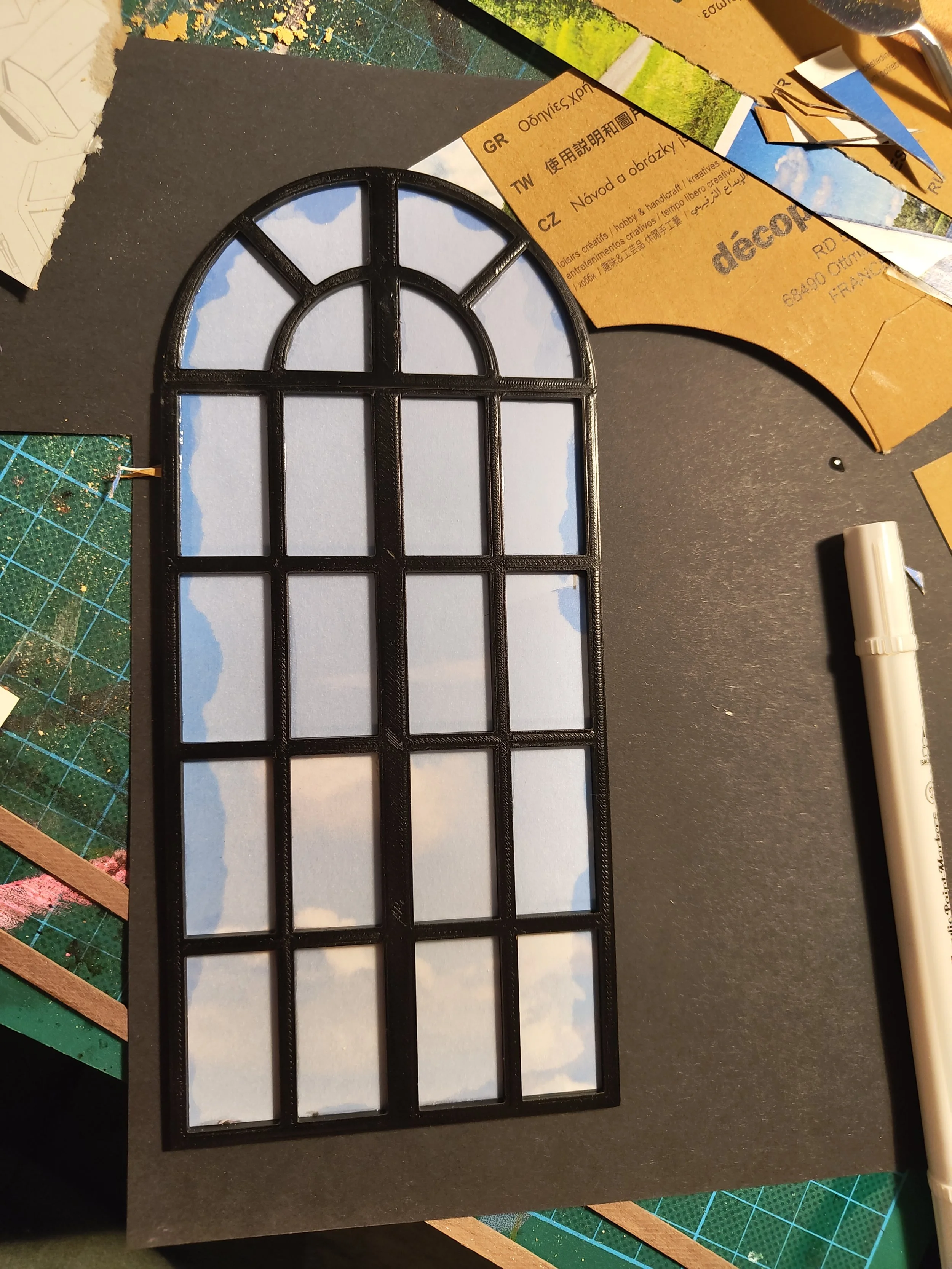 I spray painted the window frame, added a picture and chalk paper to diffuse the picture. The darker blue is from the glue I used, I fixed this by adding clouds in white acrylic pens.