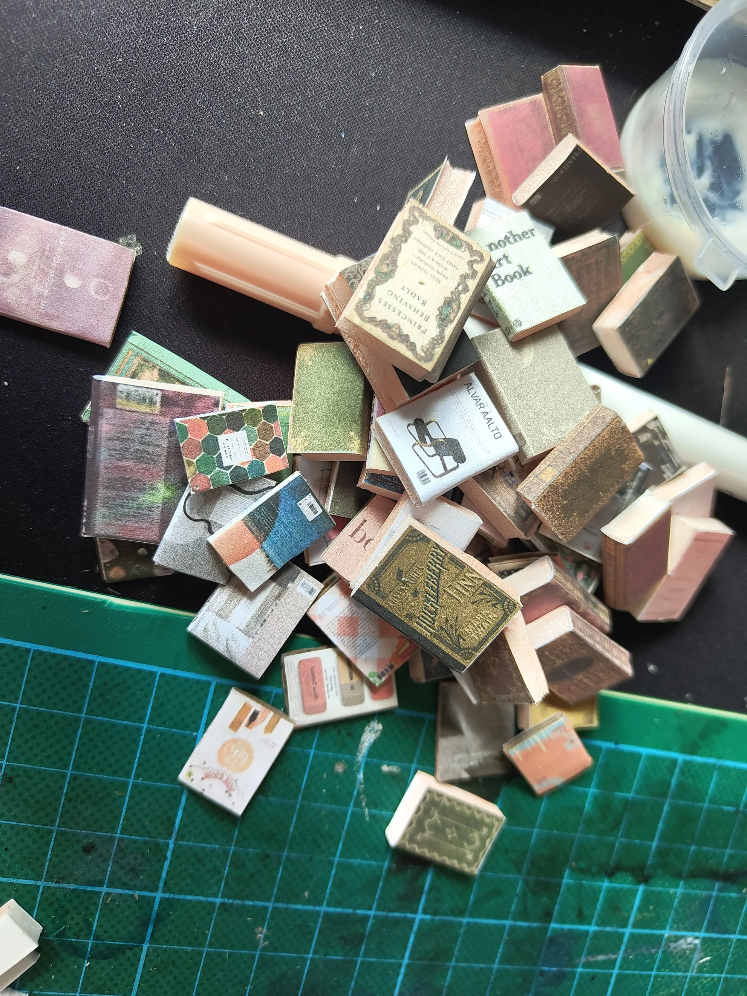 Tiny books! I searched the internet for book covers that I could print, scaled them and printed them. Cardboard was cut in the right size and the covers were glued on them.