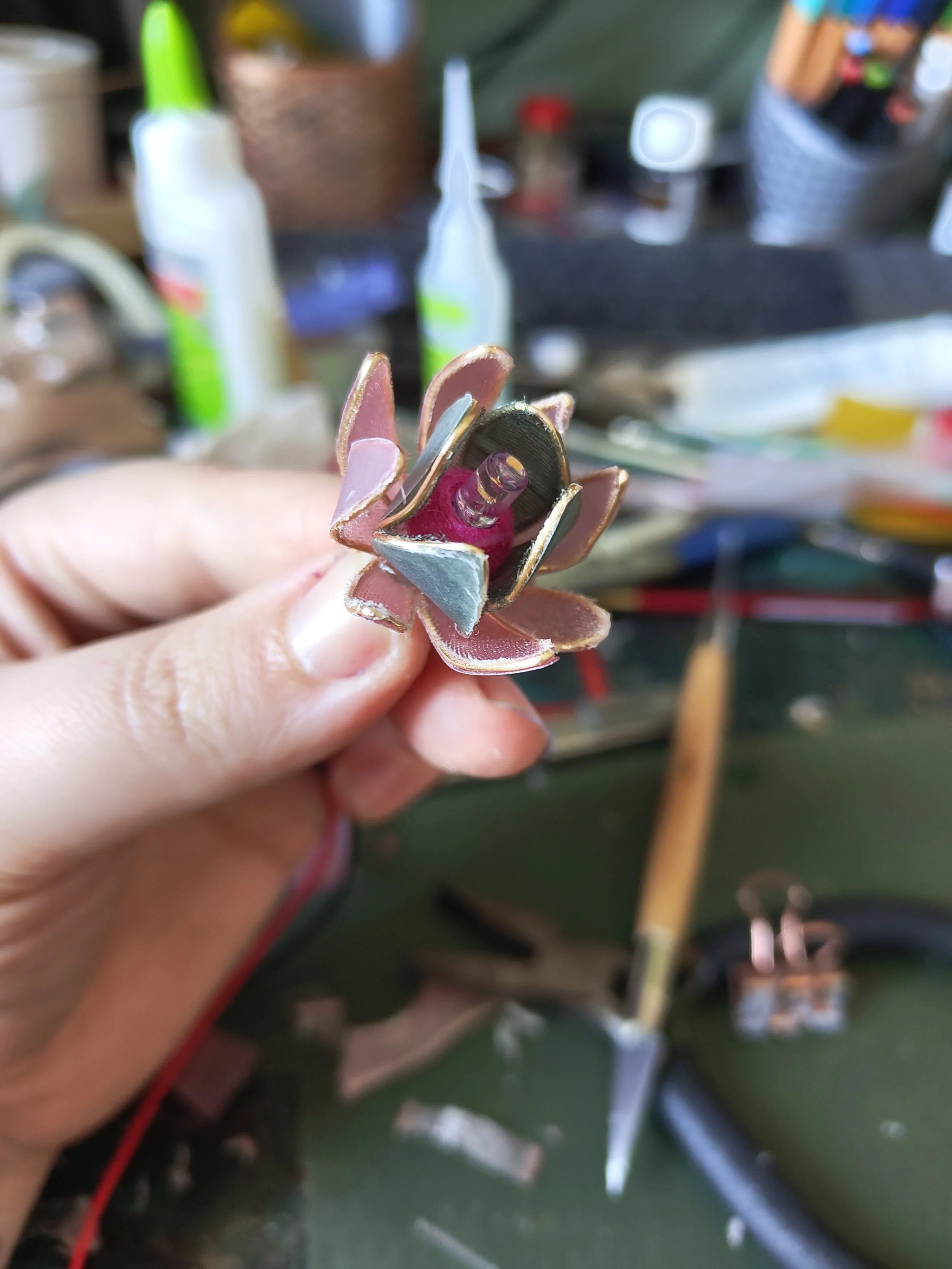 The spider I made from pearls and gold wire. I painted the green pearl.