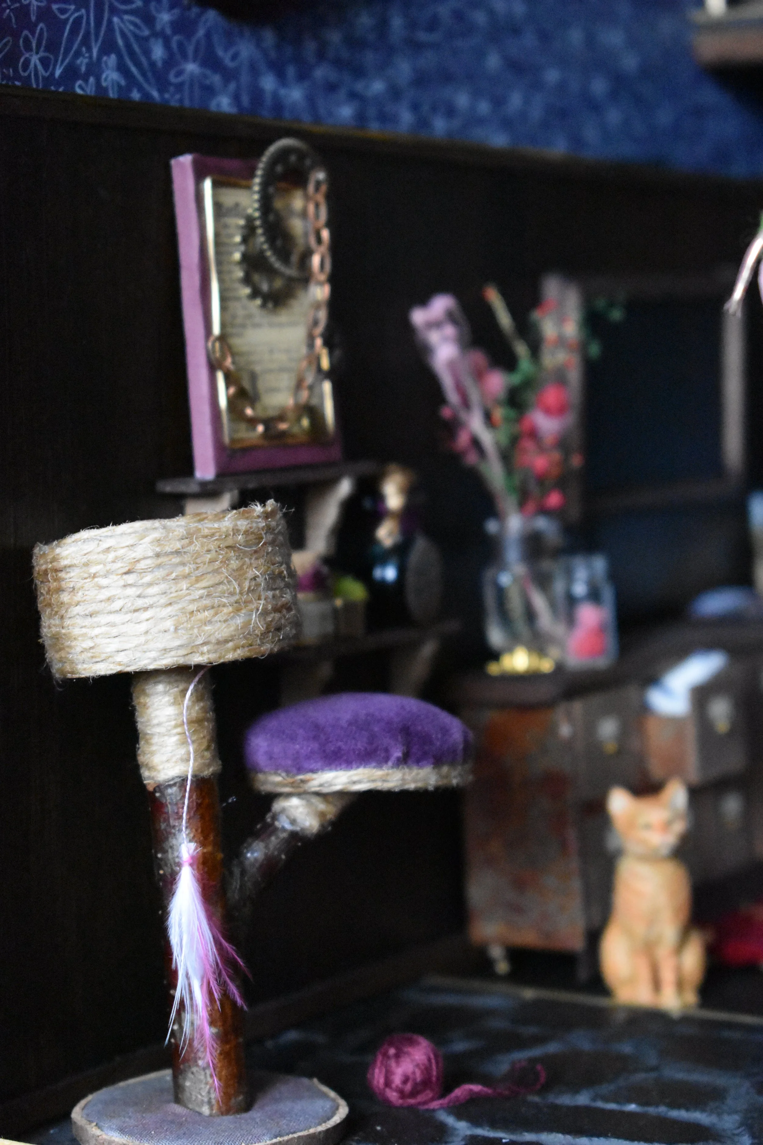 I wanted cats in the Book Nook and I wasn't going to make them from scratch so I painted 2 cats I bought from the store. This one is the before with a magenta base coat.